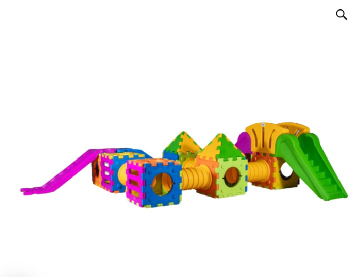 Un set modulare per area gioco 5,5 × 4,5 metri, composto da numerosi elementi assemblabili che consentono di realizzare cubi, casette, tunnel, ponti e percorsi tridimensionali complessi, adattabili allo spazio disponibile e alle esigenze educative.